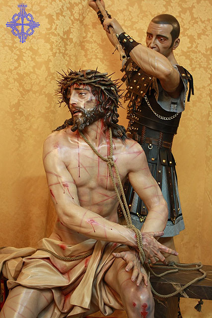 Las imágenes están talladas en madera de cedro real y nos muestra a Cristo, sentado en un banco que simula el mármol cordobés, maniatado y totalmente destrozado tras la flagelación y a un soldado romano que acaba de incrustar la corona de espina en la cabeza del Señor, siendo esta imagen de vestir, tal y como lo demuestra sus ropas militares.