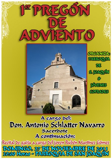 El acto organizado por la Parroquia de San Joaquín y la Asociación Juvenil Jóvenes Cofrades de Cieza se celebrará el domingo 27 de noviembre a las 20:00 horas en la Parroquia de San Joaquín de Cieza.