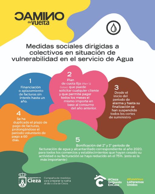 • Se ha dispuesto un Fondo Social para hacer frente a los conceptos de agua y alcantarillado en aquellos recibos de abonados domésticos que los Servicios Sociales del Ayuntamiento de Cieza determinen, y los Comercios e Industrias que por su tipo de actividad hayan podido verse afectados por el COVID-19. Se pondrán a disposición de todos ellos unos formularios específicos para solicitar la bonificación del 2º y 3º periodo de facturación correspondiente al año 2020.