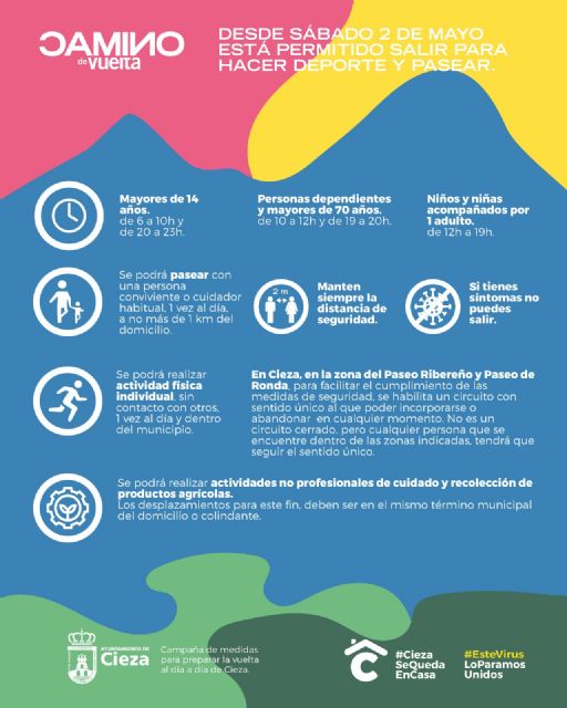 Ante la Orden SND/380/2020 de 30 de abril, sobre las condiciones en las que se puede realizar actividad física no profesional al aire libre durante la situación de crisis sanitaria ocasionada por el COVID-19, a partir del próximo 2 de mayo, el Ayuntamiento de Cieza aclara: