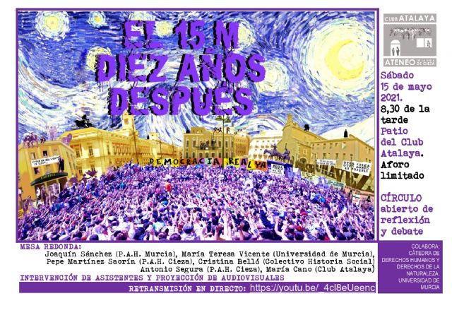 Coincidiendo con el décimo aniversario del 15M, el Club Atalaya ha organizado para este próximo sábado 15 de Mayo, a las 20, 30 horas un círculo abierto de reflexión y debate.
