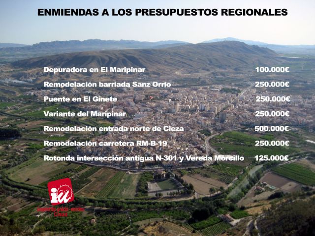 Mediante un comunicado de prensa, el portavoz de economía de IU-Verdes de Cieza, Antonio Penalva, ha criticado las "escasas" inversiones contempladas para Cieza en los presupuestos de la CARM para 2021, al tiempo que han dado a conceder las enmiendas presentadas dentro del espacio Unidas Podemos, señalando que "Cieza, un año, más vuelve a quedar en una posición muy alejada de la que le corresponde por su población en materia de inversiones".