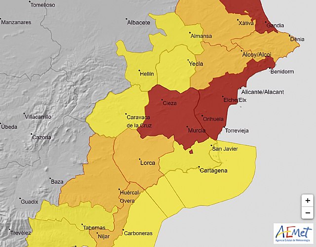 El aviso rojo en la Vega del Segura comienza a las doce del mediodía y acaba a medianoche y al tener una probabilidad de un 70 por ciento se da prácticamente por seguro. Para decretar ese aviso rojo se tienen que alcanzar los 44º.