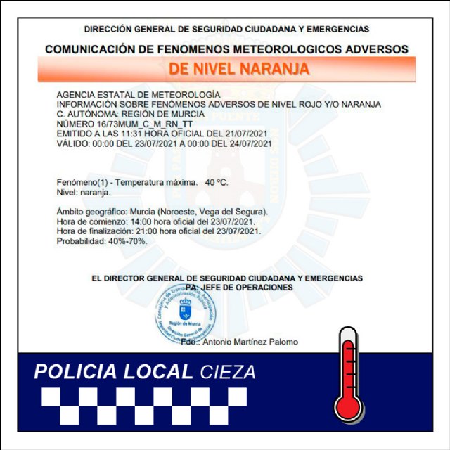 Fuentes del Ayuntamiento de Cieza informan de que la AEMET ha activado para este viernes y sábado el aviso naranja en la Vega del Segura, incluida Cieza, por temperaturas a la sombra superiores a 40 grados centígrados.