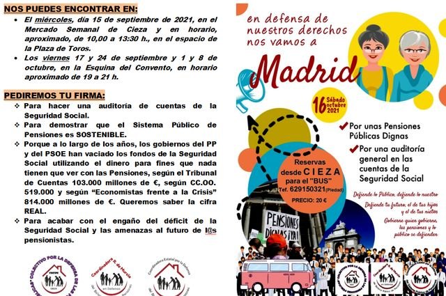 El sábado, día 16 de octubre, tendrá lugar en Madrid una manifestación convocada por los colectivos sociales que defienden las pensiones públicas. Se espera que la participación sea muy importante, ya que el momento histórico en que se celebra es clave, cuando está en proceso de elaboración y discusión el anteproyecto de ley para la reforma de las pensiones públicas en España.