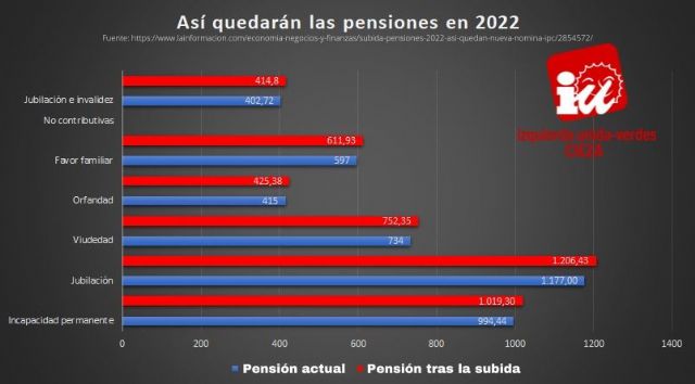 IU-Verdes de Cieza ha destacado que las pensiones subirán un total del 4,1% en 2022 con el gobierno PSOE/Unidas Podemos, sumado el incremento del 2,5% de revalorización más el 1,6% de la "paguilla", mientras que de aplicarse la reforma aprobada en 2013 por el PP de Mariano Rajoy se incrementarían en un raquítico 0,25%. En este sentido, su portavoz de Economía, Antonio Penalva, ha recordado que la reforma de las pensiones que aprobó en solitario el Gobierno de Mariano Rajoy en el año 2013 tuvo importantes consecuencias para los bolsillos de los jubilados y para ello apunta un dato revelador: entre 2013 y 2017 el porcentaje de población mayor de 65 años en riesgo de pobreza escaló del 12,9% al 17,6%, hasta superar los 1,5 millones de personas.