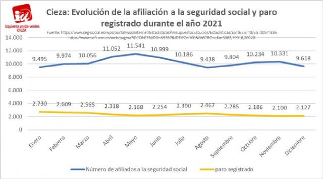 Tras analizar los datos de paro y afiliación a la seguridad social del mes de diciembre y su evolución a lo largo del pasado año en Cieza, IU-Verdes del municipio ha concluido que los mismos están en la línea de los que se han dado a nivel regional y nacional. Antonio Penalva, portavoz de Economía y Empleo de IU-Verdes de Cieza, ha destacado que 2021 cerró con la creación de 122 empleos netos y un 20,6% menos de parados registrados.