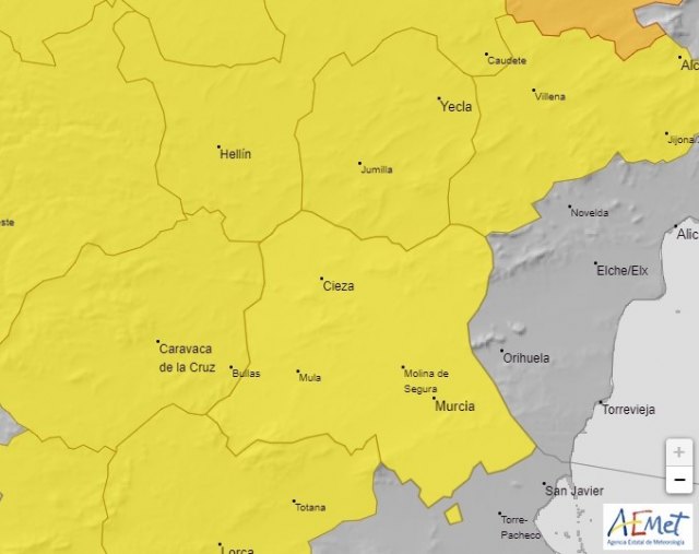 Fuentes del Ayuntamiento de Cieza informan de que la AEMET ha actualizado los datos de previsión para las próximas horas y establecen alerta amarilla por riesgo de tormentas en la Vega del Segura, incluida la Comarca de Cieza.