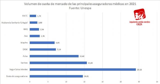 Poniendo "rostro" a las empresas que acaparan el negocio privado de la salud, el portavoz ha explicado que cinco aseguradoras acaparan el 71,3% del negocio: SegurCaixa Adeslas ( 29,16%), Sanitas (15,68%), Asisa (13,42%), DKW (7,19%) y Mapfre (6,85%).