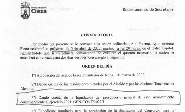 Añaden que "hay que recordar que la liquidación del año 2021 se aprobaba en marzo de 2022, y desde entonces ha estado en poder de todos los concejales, incluso en abril de 2022 se daba cuenta al Pleno, siendo desde entonces un documento público a disposición de todos. Carece por tanto de sentido que haya concejales que se quejen de falta de información cuando la realidad es que tenían ese documento. Por tanto, no se ha vulnerado derecho alguno, y además la liquidación del año 2021 no modifica ni altera el Presupuesto de 2022 ni despliega efectos jurídicos sobre el mismo".