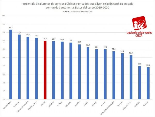 IU-Verdes de Cieza, tras conocer los últimos datos del Ministerio de Educación correspondientes al periodo escolar 2019/20, ha señalado que la asignatura de Religión católica continúa perdiendo alumnos, a pesar del impulso que trató de darle la Lomce en el currículum educativo y de que el sueldo de los docentes que paga el Estado batió su récord en 2021, con 115 millones de euros.