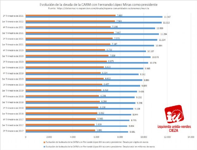 Tras conocer los datos publicados por el Banco de España, IU-Verdes de Cieza ha mostrado su preocupación por el continuo crecimiento de la de deuda pública de la Comunidad Autónoma de Murcia que, en el segundo trimestre de 2022 alcanzó 11.587 millones, 7.610 euros por habitante, con un crecimiento de 433 millones de euros en los últimos 12 meses.