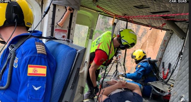 Helicoptero de la Dirección General de Seguridad Ciudadana y Emergencias con el grupo de rescate aéreo, formado por 3 bomberos del CEIS, proceden al rescate de un senderista que ha caído desde una altura de 50 metros entre la presa de la Mulata y la central hidroélectrica de Almadenes, en término municipal de Cieza.