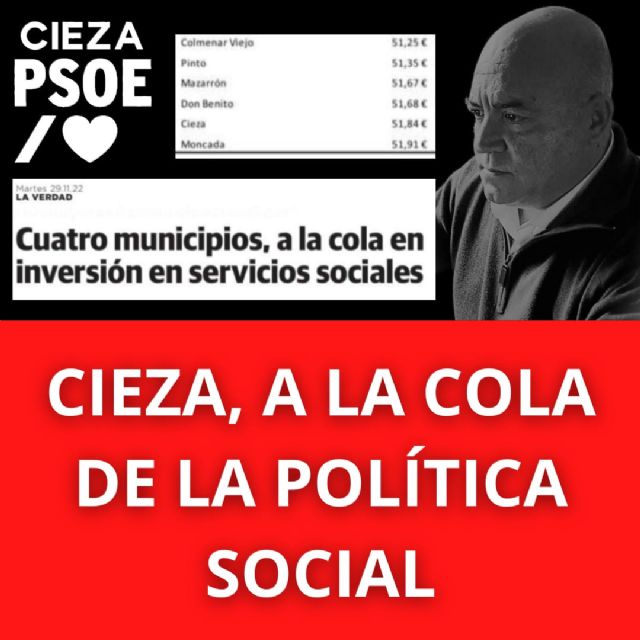 Esto sitúa a Cieza como un municipio pobre en servicios sociales, al encontrarse entre los 37 municipios con menor inversión en la materia, por debajo de los 52,12 € que marcan el 60% de la mediana del gasto de los Ayuntamientos mayores de 20.000 habitantes, según un informe emitido por la Asociación de Directores y Gerentes de Servicios Sociales.