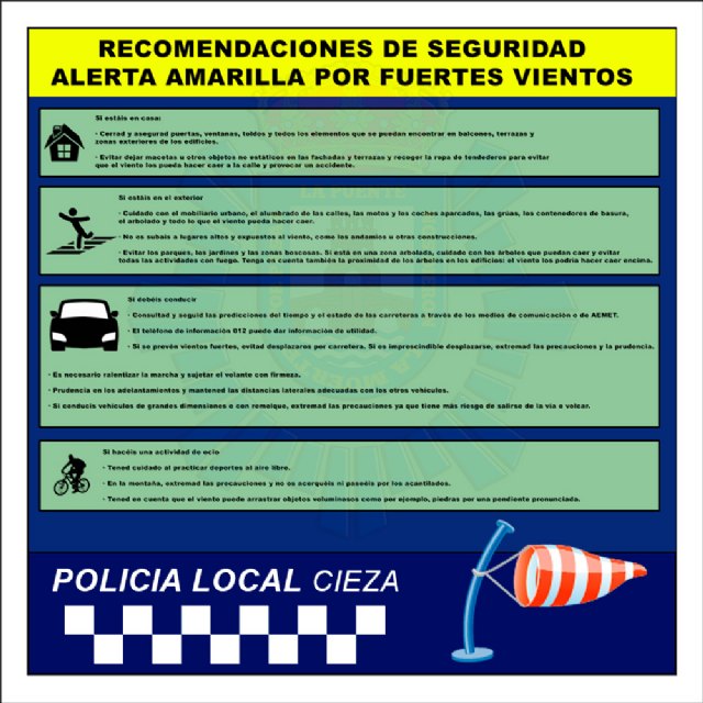 Fuentes del Ayuntamiento de Cieza informan de que la AEMET ha establecido para este martes el aviso amarillo en la zona de Cieza por fuertes vientos.