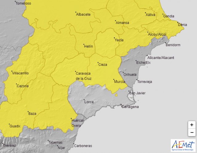 AEMET ha establecido uno de nivel amarillo por lluvias y tormentas para esta jornada en las comarcas de la Vega del Segura, incluida Cieza, Noroeste y Altiplano que estará vigente entre las 12 del mediodía y las once de la noche por precipitaciones acumuladas en una hora de 15 litros/m2.