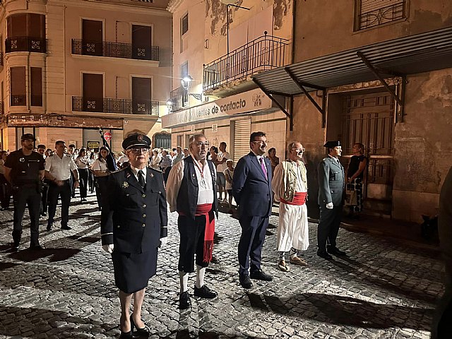 El alcalde de Cieza, Tomás Rubio, y el presidente de la Hermandad de San Bartolomé, Cristóbal Herrera, presidieron el cortejo procesional junto a un representante del pregonero de este año, los Coros y Danzas de Cieza, y los mandos de la Policía Local y Guardia Civil. Distintos miembros de la Corporación Municipal, los diputados regionales Miriam Guardiola y Miguel Ortega y un representante de la Junta de hermandades Pasionarias de Cieza también integraron la comitiva que cerraba la Banda Municipal de Música bajo la dirección de Ginés Martínez Morcillo.