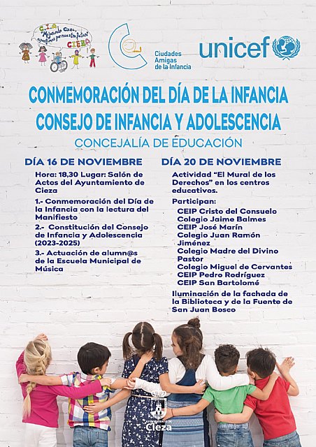 La Concejalía de Educación, a través del Consejo de Infancia y Adolescencia, conmemorará el Día de la Infancia con una serie de actos a realizar los días 16 y 20 de noviembre. Así, el salón de actos del Consistorio ciezano acogerá la celebración de esta jornada el día 16, a las 18.30 horas, con la lectura de un manifiesto, la constitución del Consejo de Infancia y Adolescencia 2023-2024 y la actuación de alumnos de la Escuela Municipal de Música.