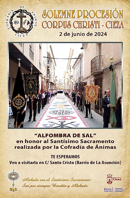Desde hace dos años, y este 2024 será el tercero, la Cofradía de Ánimas confecciona una alfombra de sal como señal de alabanza a la Sagrada Eucaristía. En esto caso la alfombra cubrirá toda la calle Santo Cristo, 27 metros de longitud y más de 80 metros cuadrados. Motivos religiosos, signos de la Semana Santa, así como otro dibujos que hacen un "guiño" a eventos que se celebran este año o monumentos arquitectónicos propios de nuestra localidad, formarán un conjunto que pretende ser signo de alabanza a la Eucaristía y a Jesucristo.