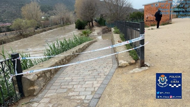 Debido al caudal que acumula el río Segura a su paso por Cieza, la Policía Local ha procedido al corte del Barranco de San Pablo (frente a la depuradora) y la entrada peatonal por el margen izquierdo del río en el puente del Argaz.