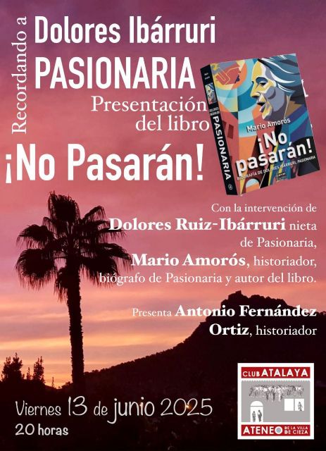 El viernes 13 de Junio, a las 20:00 horas, tendrá lugar la presentación del libro '¡No pasarán! Biografía de Dolores Ibárruri, Pasionaria', del historiador y periodista Mario Amorós, en el Club Atalaya, que contará con la presencia de Dolores Ruiz-Ibárruri, más conocida como 'Lola', nieta de Pasionaria. El acto será presentado por Antonio Fernández Ortiz, historiador.