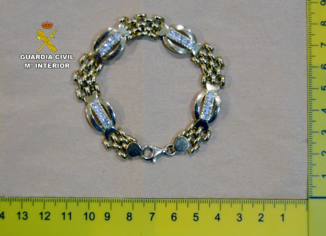 La Guardia Civil dirigió las pesquisas a la inspección de establecimientos de compra venta de oro de Cieza, localizando, en dos de ellos, dos de las pulseras de oro robadas, valoradas en más de 1.000 euros que fueron reconocidas y devueltas a su legítima propietaria.