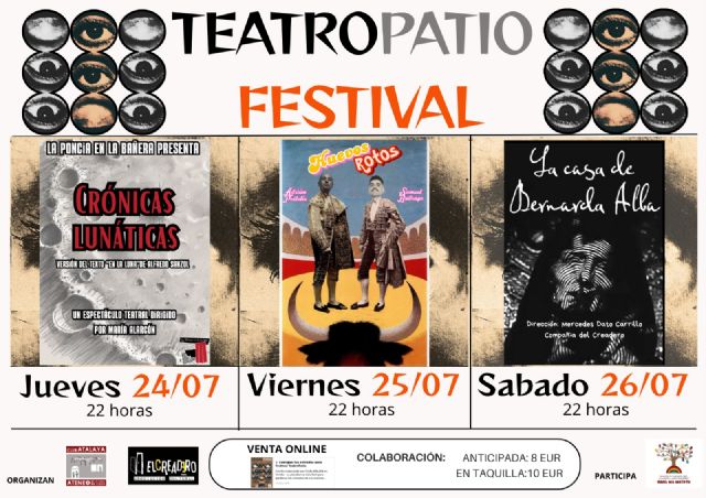 El jueves 24 dará el pistoletazo de salida la obra 'Crónicas lunáticas', producida por el grupo de teatro murciano 'La Poncia en la bañera', que dirige la ciezana María Alarcón. El viernes 25 se sube a las tablas del escenario el recientemente elegido pregonero de la Feria de Cieza 2025, Samuel Buitrago, en compañía de Adrián Portolés, para deleitarnos con la función 'Huevos Rotos' y cuya recaudación irá destinada a la Asociación de Cooperación y Ayuda Humanitaria 'Mama Wa Watoto', que creó la madre del actor ciezano. El sábado 26 cierra el festival 'La casa de Bernarda Alba', de Federico García Lorca, en una adaptación de Mercedes Dato Carrillo, directora de la obra y presidenta de 'El Creadero Asociación Cultural'.