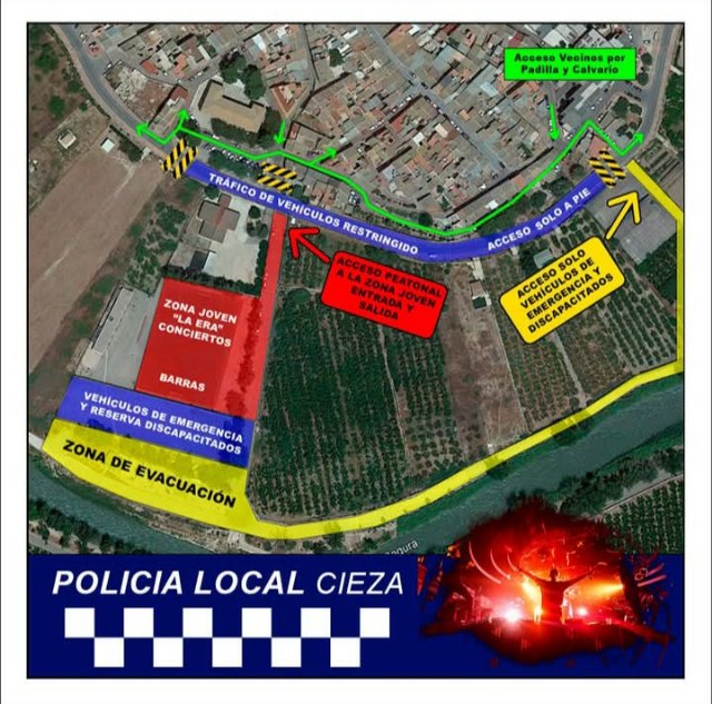 Con motivo de la Feria y Fiestas en honor a San Bartolomé, la Policía Local de Cieza informa a los vecinos del acceso a la Zona Joven del recinto de La Era cuya entrada es gratuita. El lugar por donde se entra es por el Centro de Salud Cieza Oeste, a través de las calle Padilla, Calvario y/ Casas del Barco.