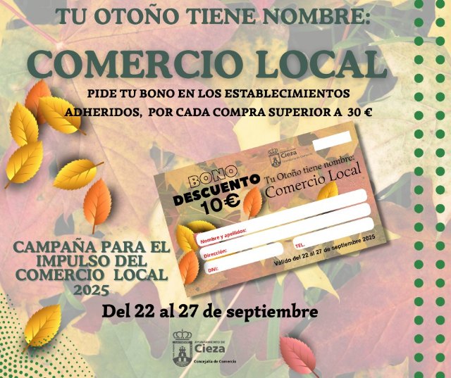La Concejalía de Comercio del Ayuntamiento de Cieza ha organizado una campaña de bonos por un importe total de 50.000 euros, que se van a repartir en 5.000 bonos de 10€ de descuento para los clientes que realicen sus compras en los comercios locales adheridos a dicha campaña. La misma comenzará este lunes 22 y se prolongará hasta el sábado 27 de septiembre.