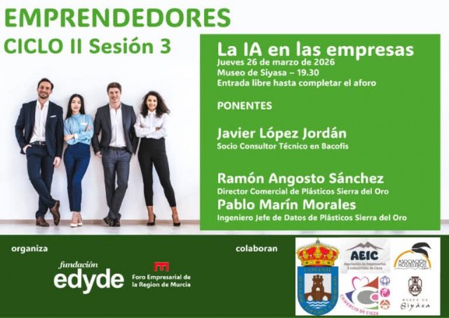 En este ciclo de emprendedores colaboran el Ayuntamiento de Cieza, la Asociación de Empresarios e Industriales de Cieza, Asociación Comercio de Cieza, Asociación de Hosteleros de Cieza y el Museo Siyâsa.