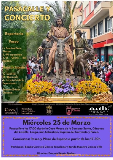 La Banda Carmelo Gómez Templado y la Banda Maestro Gómez Villa, bajo la dirección de Ezequiel Marín Molina, ofrecerán este miércoles un pasacalle, a partir de las 17.00 horas, por el recorrido habitual y conciertos, a partir de las 17.30 horas, en el Paseo y la Plaza de España. Se trata de una iniciativa apoyada por el Ayuntamiento de Cieza, el Conservatorio de Música Maestro Gómez Villa y la Junta de Hermandades Pasionarias de Cieza.